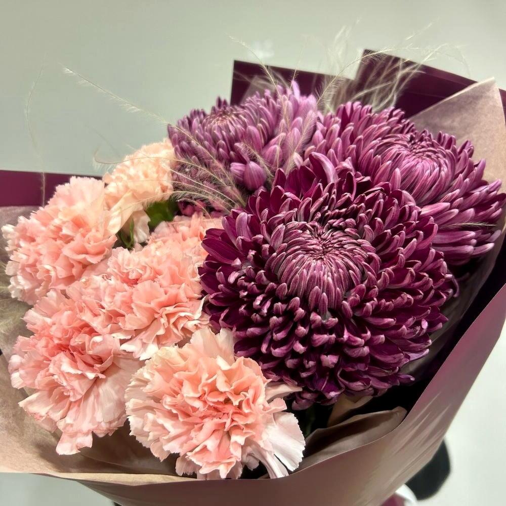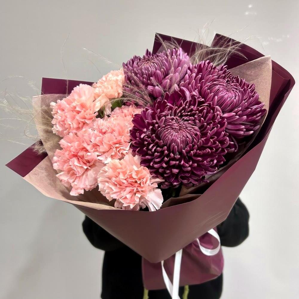 Букет хризантем и диантусов с ковылью для жены А044 в Пикалёво